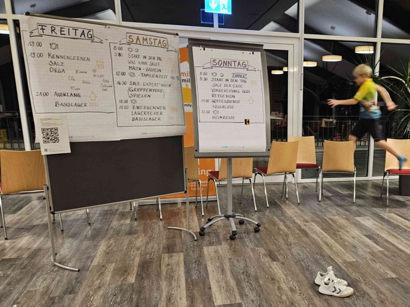 Der Freitagabend startete mit einer spielerischen Kennenlernrunde: Namensluftballons wurden in die Luft geworfen, ein zufälliger gefangen – und schon begann ein erstes Gespräch. Klassische Kreisspiele halfen zusätzlich, das Eis zu brechen. Nach dem Abendessen stellten sich alle Familien mit funkelnden Salzkristallen vor und fanden beim Kennenlern-Bingo viele Gemeinsamkeiten. Das Märchen von der Salzprinzessin eröffnete anschließend das Thema und zeigte, warum Salz wichtiger als Schmuck und Gold ist. Während die Erwachsenen Organisatorisches klärten, nutzten die Kinder die Turnhalle für eine lebhafte Betreuungsrunde. Ein Abendimpuls in der Hauskapelle mit ruhigem Gesang und Überlegungen, für welche schmackhaften Momente am Tag man dankbar ist und welche unschönen Dinge man loslassen möchte, rundete den Abend ab.
