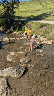 Am Samstag unternahm die Gruppe eine Wanderung in Rettenberg – bei sommerlicher Hitze war der kühle Bach genau das Richtige: Ob mit den Füßen im Wasser (manchmal auch mehr als die Füße), beim Staudammbauen aus Steinen oder einfach beim Laufen am schattigen Galetschbach, der Wasserspaß kam nicht zu kurz. Auch das Hallenbad direkt neben dem Hotel mit seiner großen Reifenrutsche sorgte für leuchtende Kinderaugen. Am Abend versammelten sich wieder alle im Garten und anschließend sorgten Spiele wie „Dobble“ und „Phase 10“ für viele Lacher.